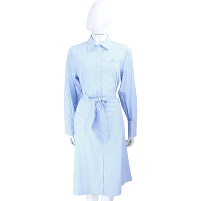 KARL LAGERFELD KL草寫刺繡純棉藍白條紋綁帶襯衫式洋裝
