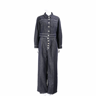 KARL LAGERFELD 卡爾 明線草寫字母飾釦藍色排釦牛仔寬褲 長褲(女款)