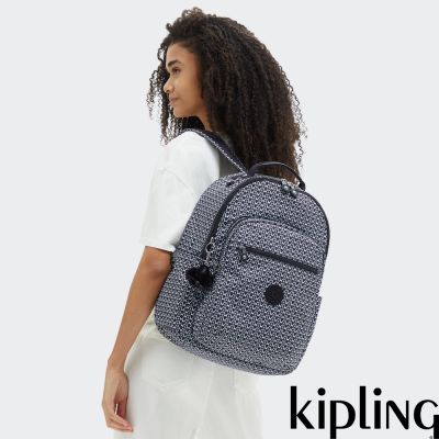 Kipling 經典黑菱格紋印花時尚拉鍊大開口後背包-DELIA M
