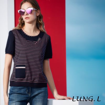 LUNG.L林佳樺 藍色底搭配粉嫩條紋拼接素面短袖棉質女裝上衣LS50A$2,53385折