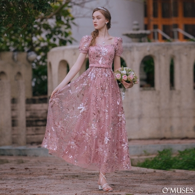 OMUSES 手工方領亮片刺繡粉色長禮服