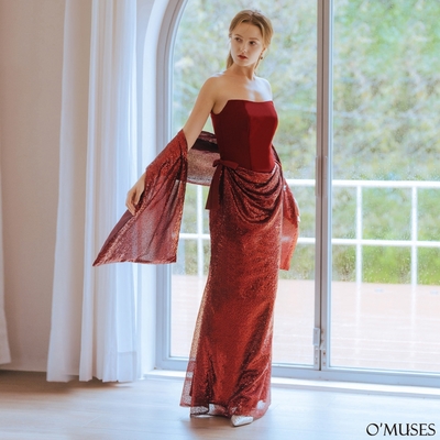 OMUSES 手工平口亮片拼接紅色魚尾長禮服