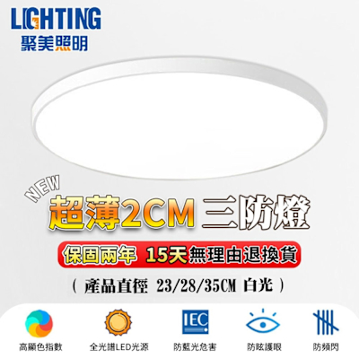 【聚美照明】吸頂燈 2-3坪 2cm超薄三防吸頂燈 三色變光護眼吸頂燈 走廊燈 臥室燈 陽台燈 浴室燈 廚房燈(防潮/防霉/防蚊/防蟲/防霧)28cm$359