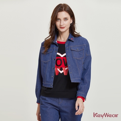 KeyWear奇威名品 趣味印花愛心牛仔外套-深藍色