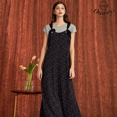 OUWEY歐薇 繽紛小碎石印花甜美綁結吊帶寬褲(黑色;S-L)3223437621$866