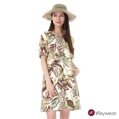 KeyWear奇威名品 V領印花短袖洋裝-綜合色