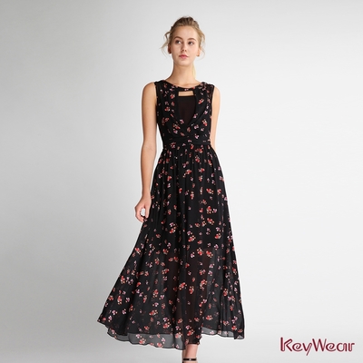 KeyWear奇威名品 絲質優雅印花切割無袖洋裝-黑色
