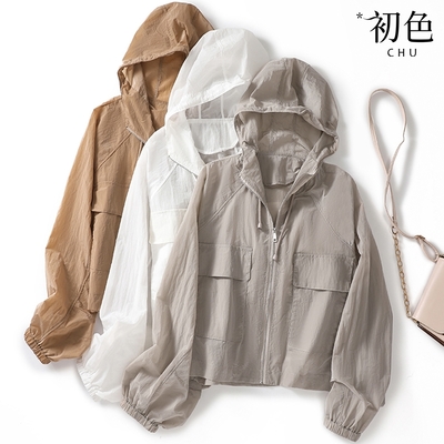 初色 素色泡泡袖連帽防曬外套上衣-共4色-62577(L/XL可選)$349