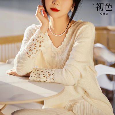 初色 純色掛脖鏤空鈕扣裝飾V領長袖修身針織毛衣上衣女上衣-共2色-39813(F可選)