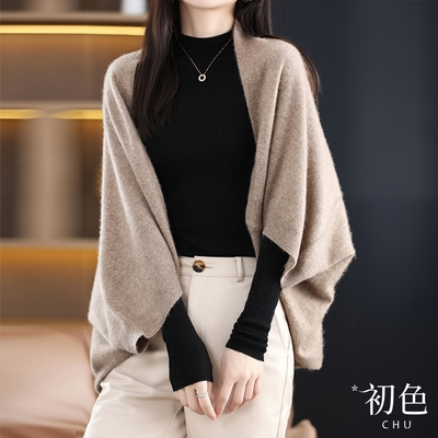 初色 純色輕薄寬鬆蝙蝠袖七分袖披肩圍巾兩用針織開衫外套-共3色-31215(F可選)$299