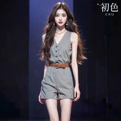 初色 素色V領無袖單排扣襯衫女上衣+短褲連身褲套裝-灰色-35870(M-XL可選)