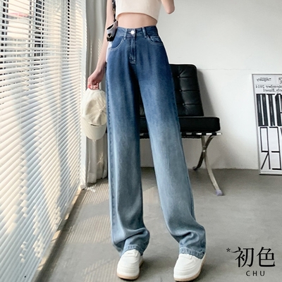 初色 漸層寬鬆顯瘦直筒高腰垂感抗皺薄款闊腿牛仔長褲-藍色-69704(M-2XL可選)$349
