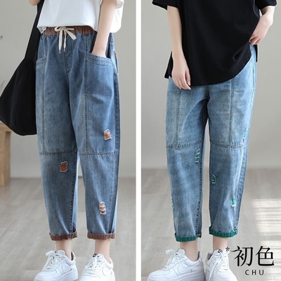 初色 薄款復古風破洞造型抽繩鬆緊腰寬鬆口袋牛仔休閒褲九分長褲-共2色-30942(M-2XL可選)$349