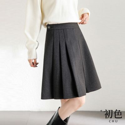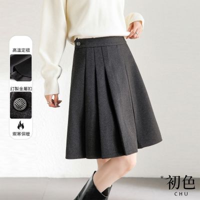 初色 學院風高腰百褶A字毛呢短裙半身裙-共2色-10165(M-2XL可選)