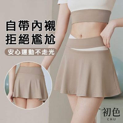 初色 拼色彈力高腰防走光假兩件遮臀運動瑜珈短裙-共4色-37491(M-2XL可選)