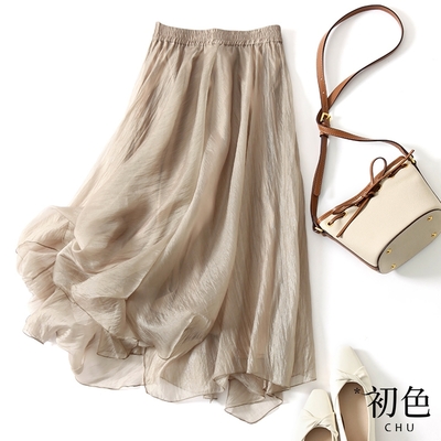 初色 文藝高腰不規則下擺抓皺A字裙-共3色-62240(M-2XL可選)$349