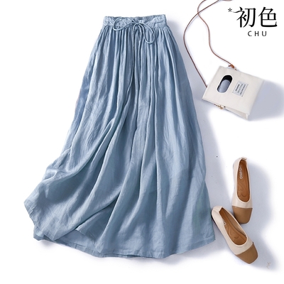 初色 棉麻風素色褶皺高腰抽繩口袋A字裙半身裙-共3色-61626(M-2XL可選)$349