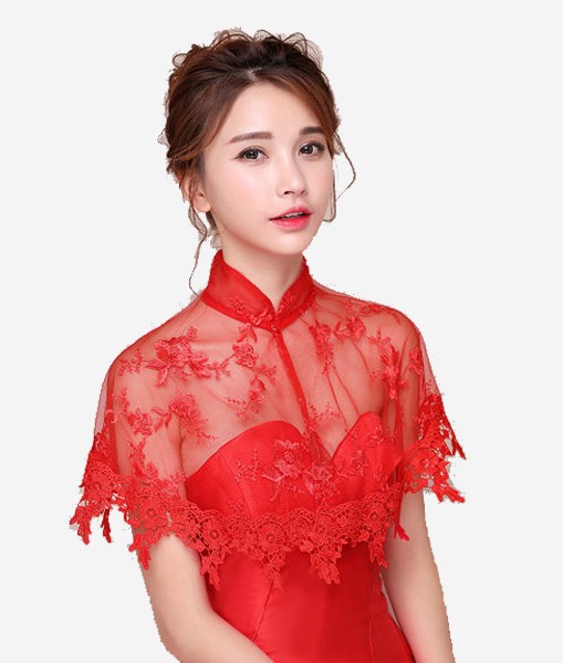 宴會 立領蕾絲網紗披肩斗篷小外套(白 紅)二色售
