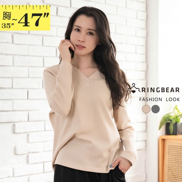 商店針織上衣--溫柔質感時尚簡約緹花針織V領寬鬆長袖上衣(灰.卡其L-3L)-X678眼圈熊中大尺碼
