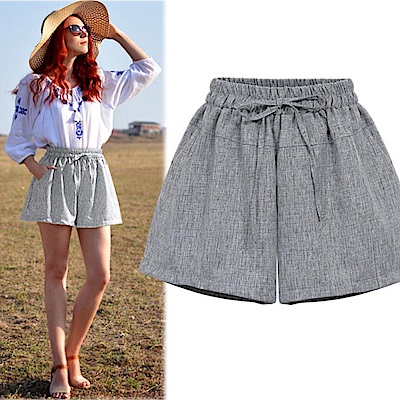 商店【V3381】shiny藍格子-夏日輕甜.休閒百搭高腰闊腿短褲