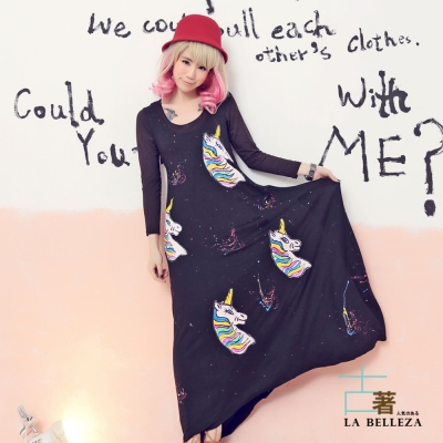 古著 粉紅獨角馬彩色潑漆U領背心長洋裝-La Belleza古著