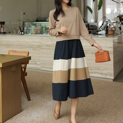 MOCO簡約時尚假兩件衛衣拼接圓領撞色層次裙擺縮腰連身裙洋裝L~4XL$499