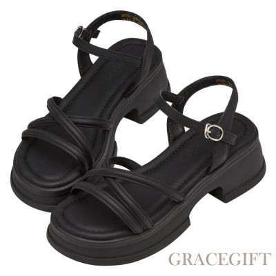 【Grace Gift】簡約奶油交叉線條雲感厚底涼鞋 黑