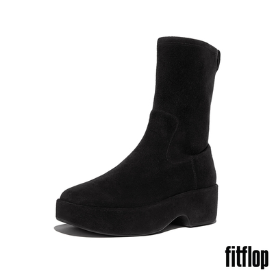 【FitFlop】F-LUMA 彈性麂皮方頭厚底中筒靴-女(靚黑色)