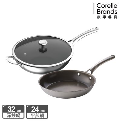 【美國康寧】(超值雙鍋組)DuraNano 晶奈無塗層不沾不鏽鋼深炒鍋 32cm+平煎鍋24cm