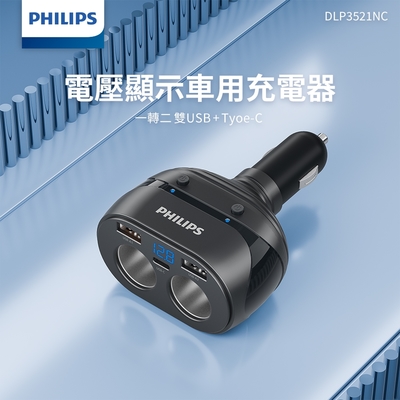 PHILIPS 飛利浦 PD 20W 電壓顯示一轉二雙USB車充 DLP3521NC