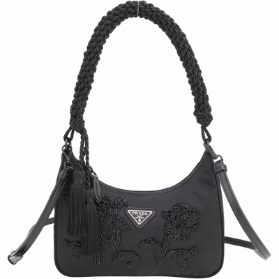 PRADA 普拉達 Re-Edition 流蘇編織提把珠花尼龍肩背/斜背腋下包(黑色)$33,11183折