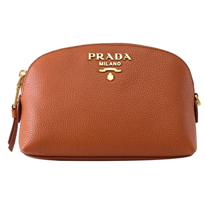 PRADA 金屬LOGO荔枝牛皮貝殼造型拉鍊萬用包/化妝包(焦糖棕)