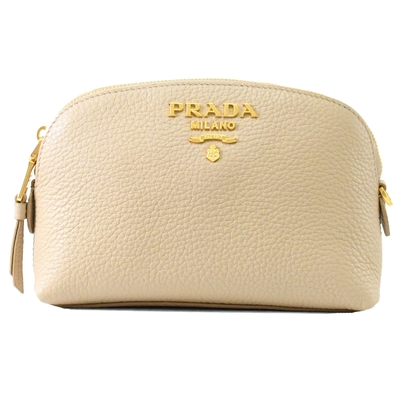 PRADA 金屬LOGO荔枝牛皮貝殼造型拉鍊萬用包/化妝包(米色)