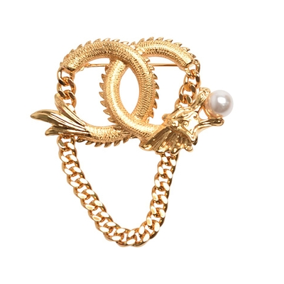 CHANEL 經典金龍含珠雙C LOGO造型胸針(金色)