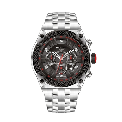 RHYTHM日本麗聲 撞色藝術防水100米三眼日期顯示石英不鏽鋼腕錶-黑框紅黑底/53mm