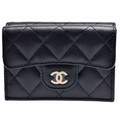 CHANEL香奈兒 經典金色雙C LOGO菱格粒紋牛皮釦式三折短夾(黑)$49,3209折