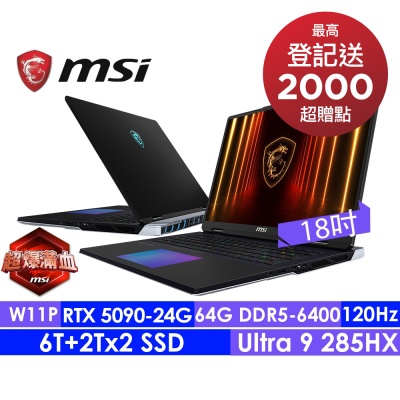 MSI微星 Titan 18 HX AI A2XWJG-610TW 18吋 4K+電競筆電(Ultra 9 285HX/64G/6T SSD/RTX5090-24G/W11Pro/120Hz)$149,900