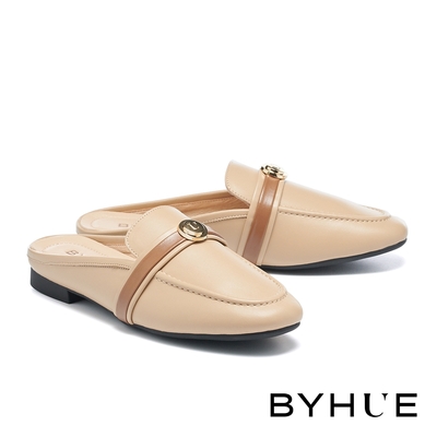 穆勒鞋 BYHUE 知性質感LOGO飾釦全真皮軟芯Q底低跟穆勒拖鞋-米