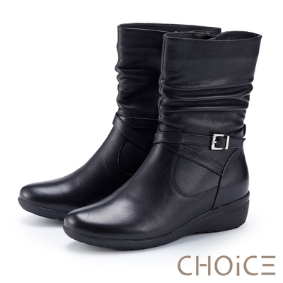 CHOiCE 牛皮抓皺皮釦拉鍊中筒靴 黑色