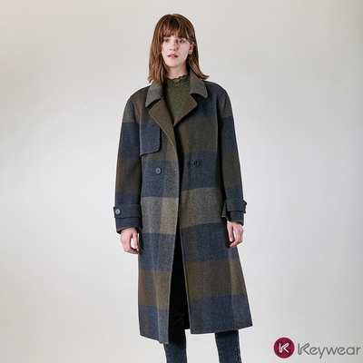 KeyWear奇威名品 格紋翻領羊毛長大衣-墨綠色