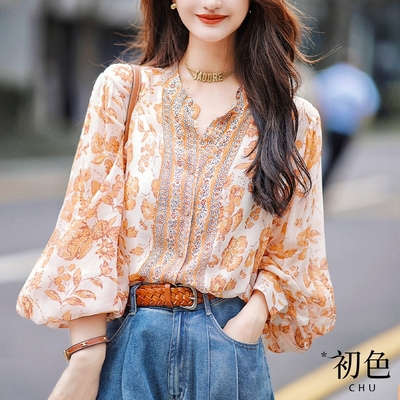 初色 復古印花橘色碎花半開領燈籠袖七分袖短袖襯衫雪紡衫上衣-花色-70112(M-XL可選)$280