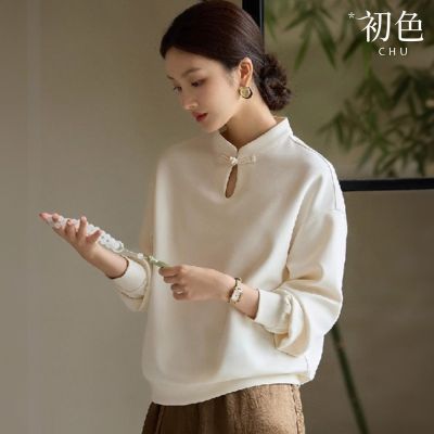 初色 中式復古風純色盤釦立領長袖T恤上衣女上衣-白色-37110(M-3XL可選)
