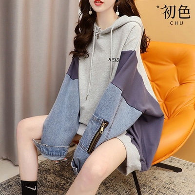 初色 假兩件撞色拼接蝴蝶結寬鬆連帽長袖帽T上衣女上衣-紫色-38152(M-3XL可選)