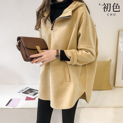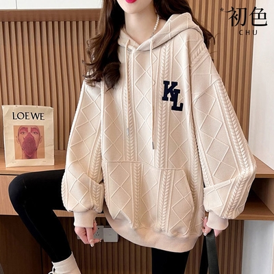 初色 簡約顆粒絨毛抽繩連帽寬鬆長袖中大尺碼帽T女上衣-共2色-39920(M-XL可選)