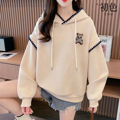 初色 純色小熊拼接幾何緹花抽繩連帽長袖T恤女上衣-共3色-39924(M-2XL可選)