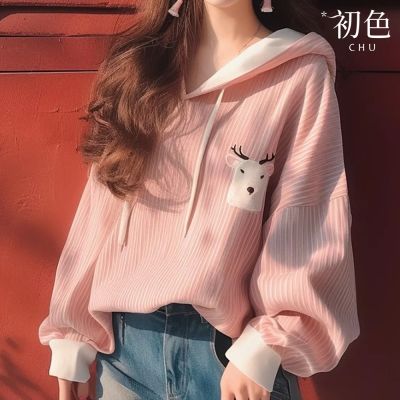 初色 條紋拼接撞色動物印花連帽抽繩長袖連帽T恤上衣-粉色-38151(M-3XL可選)