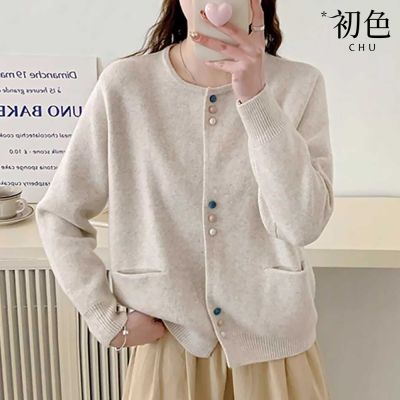 初色 純色寬鬆開衫圓領長袖針織外套女外套-共11色-38387(F可選)