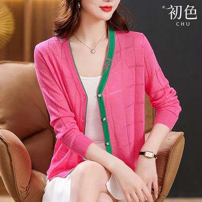 初色 V領單排扣拼色薄款小香風針織外套-共4色-66862(F可選)$299