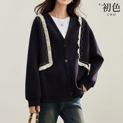 初色 復古撞色木耳邊拼接寬鬆V領單排釦長袖針織女外套-黑色-38492(M-2XL可選)
