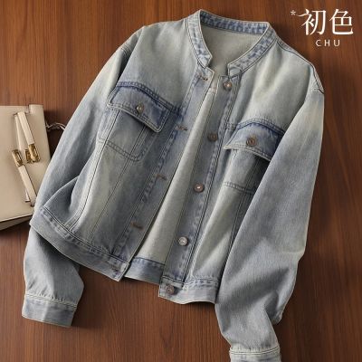 初色 復古休閒簡約大口袋水洗立領長袖牛仔外套女外套-藍色-36858(M-XL可選)$6178折